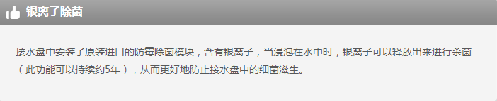 ● 接水盤(pán)中特設(shè)原裝進(jìn)口的銀離子防霉除菌模塊,有效殺菌,防止接水盤(pán)滋生細(xì)菌;