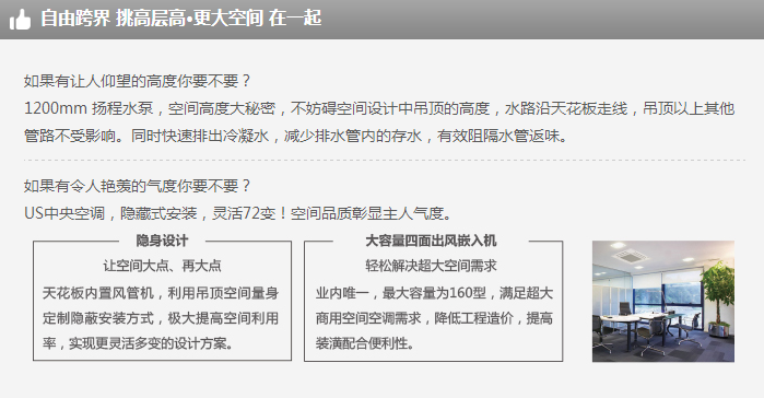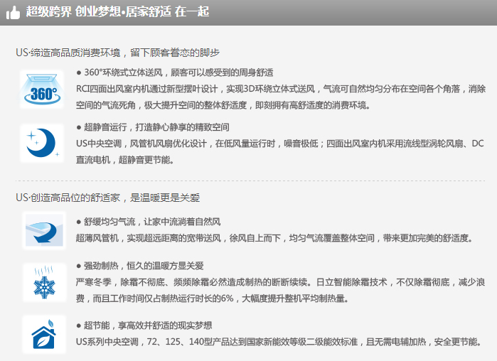 我們有兩個夢想——成就未來的創(chuàng)業(yè)夢、居家生活的品質夢。US中央空調,為您更節(jié)能的舒適夢想&更完美的創(chuàng)業(yè)夢想實現(xiàn)超級跨界,人氣即財富,和諧最完美!有夢想,就是這么任性!